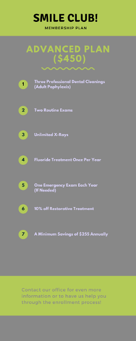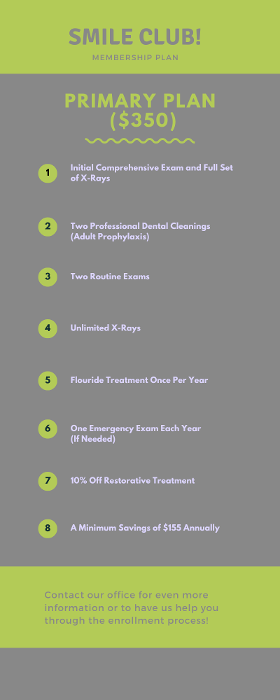 Welcome to the Smile Club! This club is for patients who do not have dental insurance coverage but are intent on maintaining optimal dental health. As regular dental care is an integral part of your overall health, this plan is designed to support you in your effort to maintain excellent oral health. This plan is not dental insurance……It’s better!